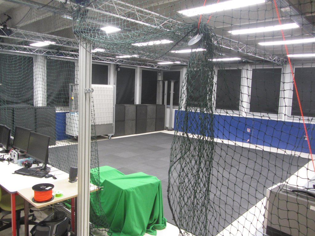 La volière mesure 8mx9m sur 2.9m de hauteur. Elle est équipée d’un système de capture de mouvement multi-caméras VICON qui reconstruit en temps réel la position et l’orientation des objets.