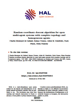 Charles MONNOYER de GALLAND de l’Université Catholique de Louvain et Renato VIZUETE, doctorant au GIPSA-lab équipe DANCE, ont reçu le prix 2022 Outstanding Student Paper Prize remis par le comité technique en charge de la thématique Networks and Communication Systems pour l’IEEE Control Systems Society, pour leur article intitulé « Random coordinate descent algorithm for open multi-agent systems with complete topology and homogeneous agents« .