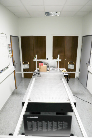Les deux salles sont équipées de tables de mesure optiques haut de gamme, dotées d’un système d’isolation pneumatique (Newport IntegrityVCS). Ce dispositif permet de réduire significativement les perturbations externes, comme les vibrations ou les bruits parasites, assurant ainsi des conditions stables pour des expériences exigeantes en précision. Les tables sont adaptées à la mise en place de montages complexes, qu’il s’agisse de tests vibratoires, de mesures acoustiques, ou d’études optiques.