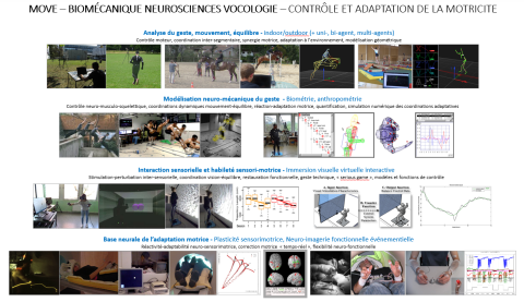 L’équipe MOVE entend promouvoir une recherche interdisciplinaire fondamentale et appliquée dans le domaine de la motricité et de l’expressivité humaine, par l’analyse neuro-biomécanique, la modélisation et l’étude du contrôle cognitif des gestes (mouvement, équilibre, voix). Trois défis scientifiques sont au centre des travaux de MOVE : la caractérisation du mouvement, la caractérisation de l’actionnement et la caractérisation du contrôle.